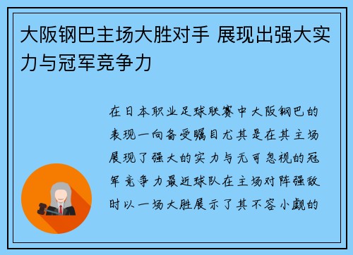 大阪钢巴主场大胜对手 展现出强大实力与冠军竞争力